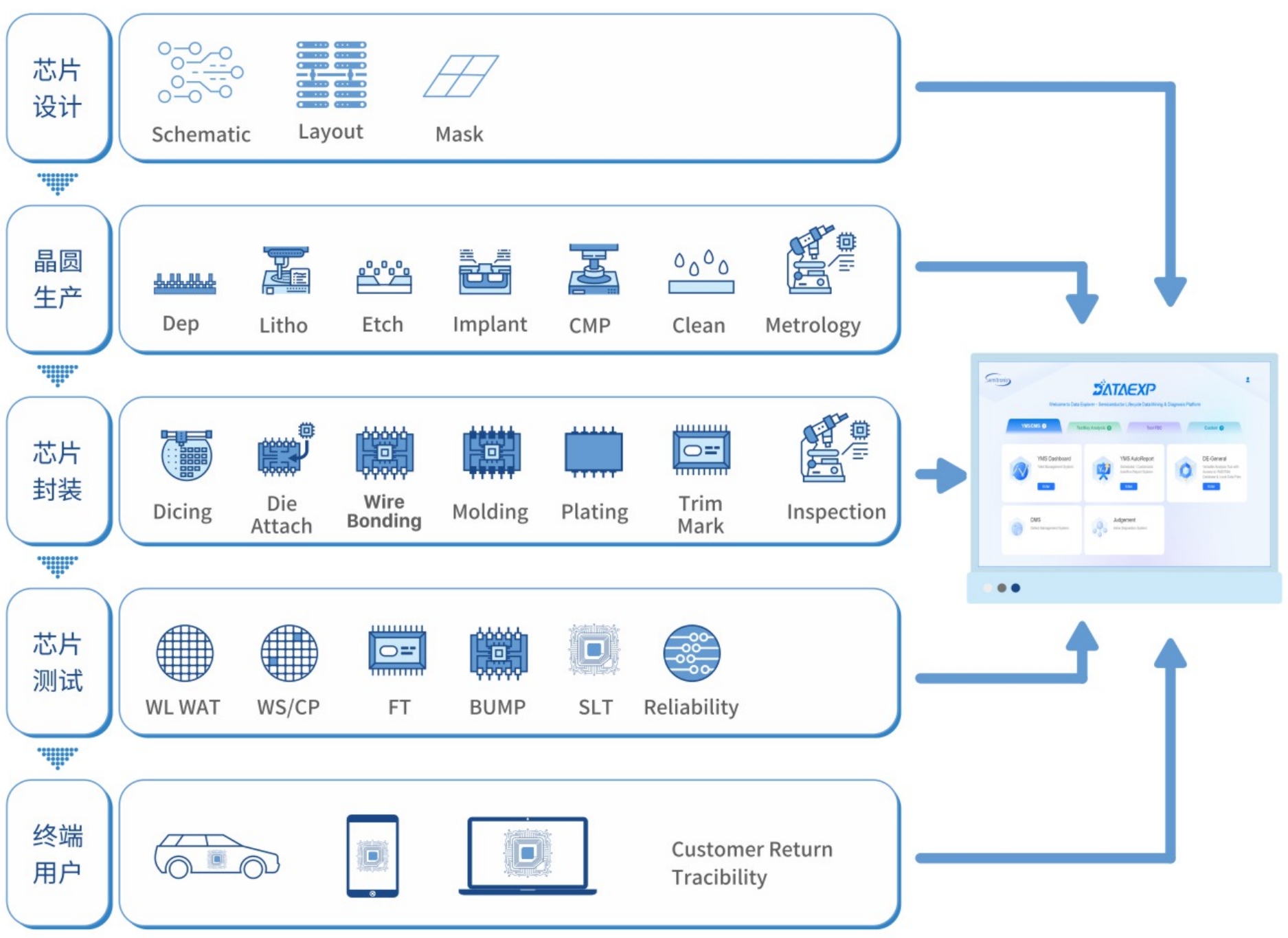 系统通过特有的算法支持和合理的数据处理流程,能够快速完成底层数据清洗、连接、整合工作,为Fab和 Fabless企业提供数据管理、良率分析、低良率成因下钻分析等方案。